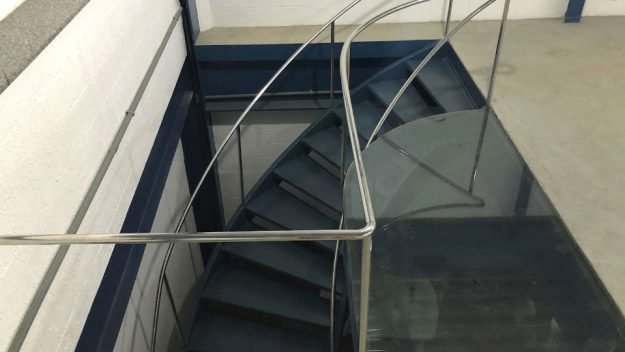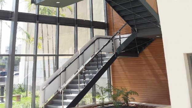 Escada metálica em aço com patamar de vidro